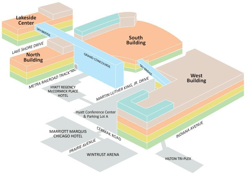 美国芝加哥迈考密会展中心 McCormick Place位于美国芝加哥市中心,会展中心总面积为22万平方米,其中会议厅有112间可容纳10,000人,各个展馆之间由占地50,00平方米的Grand Concourse休闲广场联结起来,里面有许多零售商店和各种休闲设施。北馆占地70,000多平方米,可独立使用或与其他展厅联和使用。它也拥有有29个会议厅、服务区及其它设施。湖畔中心主要用于举办中型贸易展销会和过去麦考密克(McCormick Place)会展中心不能承办的展会。南馆拥有84,000平方米的展区和17,000平方米的会议区。