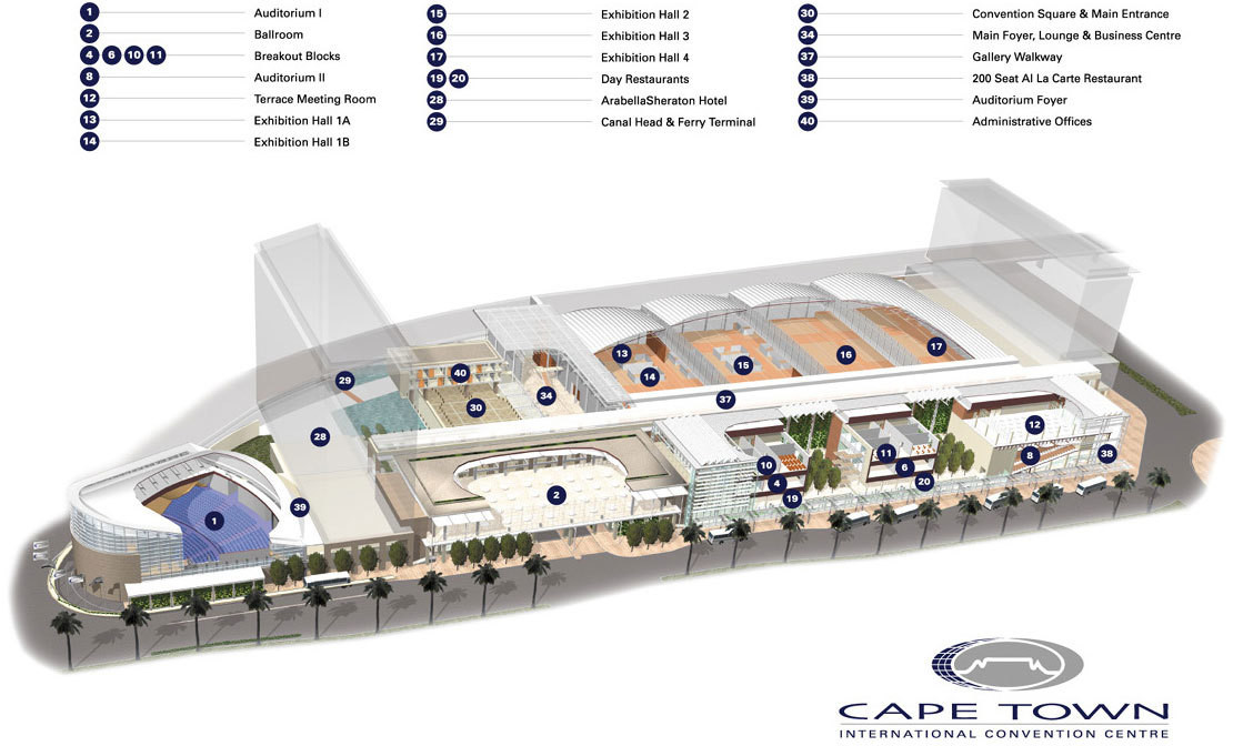 南非开普敦国际会议中心占地约6.1公顷(15英亩)它位于开普敦的维多利亚阿尔弗雷德码头广场,它的附近是主要酒店和市中心。CTICC的威斯汀酒店位于西北角在同一处所,靠近市中心。开普敦国际会议中心拥有大约11200平方米的展出空间(121000平方英尺),它可分为多个会议或宴会场地;,其中就有一个大的宴会厅。餐饮是在处所提供的。该中心有两个礼堂和一座高达1500的建筑物,其他的为620米。