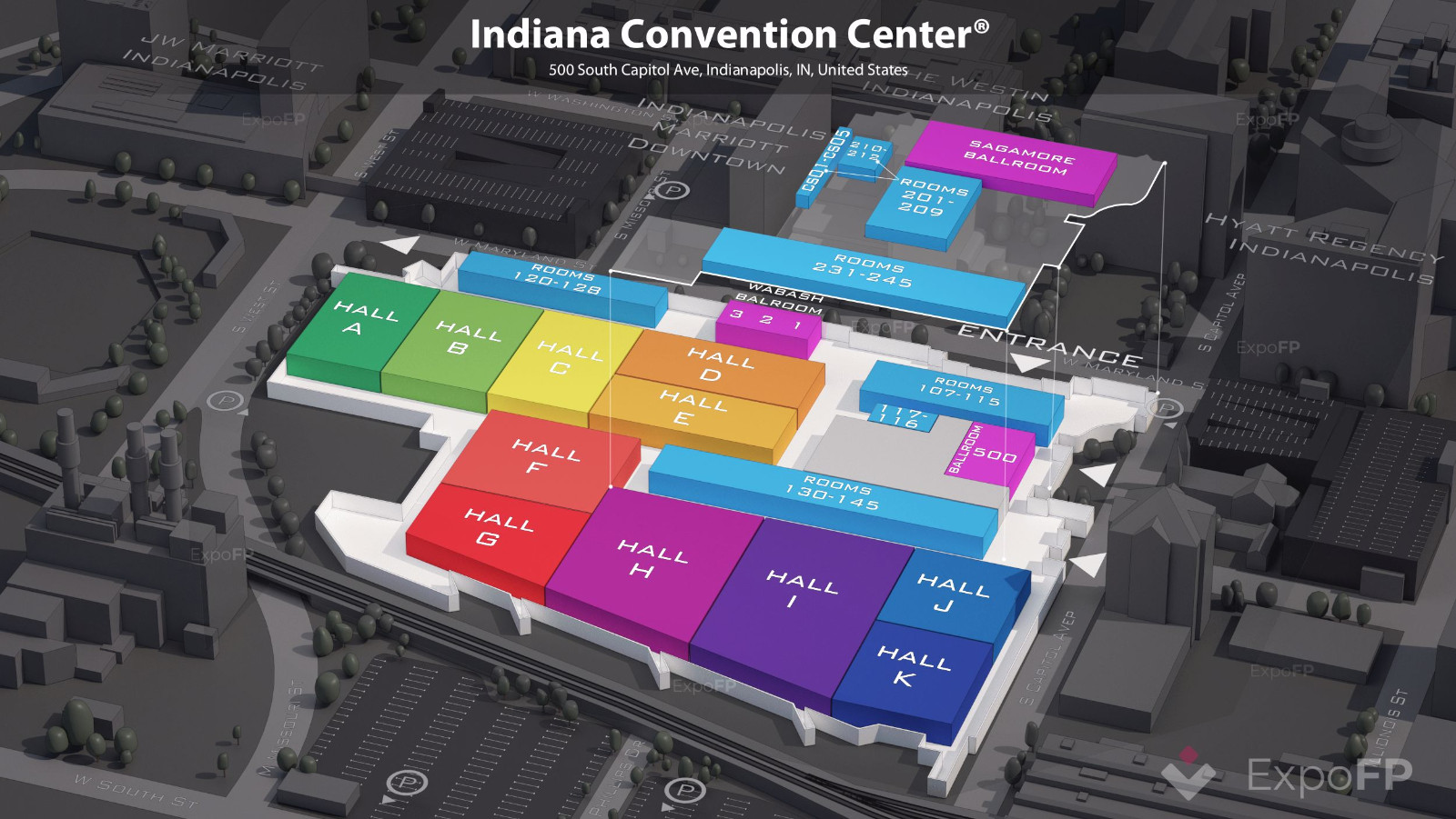 印第安纳会议中心 Indiana Convention Center是位于印第安纳波利斯,印第安纳州. 它的总面积超过1300000平方英尺(120000平方米),其中会议/会议空间的用途包括超过566000平方英尺(50000平方米)展览空间和近140000平方英尺(13000平方米)团体会议空间。在1972年建成之后,最初包括一个位于马里兰州街和国会大道西南两块。现在一共六块。总的来说,它拥有71间会议室和多个美食。它连接着卢卡斯石油体育场提供一个额外的183000平方英尺 (20,000 平方米)的会议空间和12间会议室。印第安纳国际会议中心有三个主要展厅,它位于其西端。该结构的东部部分包含500间宴会厅以及各种会议室和其他辅助设施。印第安纳会议中心在1983年扩建完成,合并印第安穹顶建筑(后来被命名为顶球场),综合成本约为8200万美元,它一半的资金是私人的,另一半是公众(纳税人)。展览厅,D和E(后改名为和重新配置)加入,与其他新的和翻新的设施。